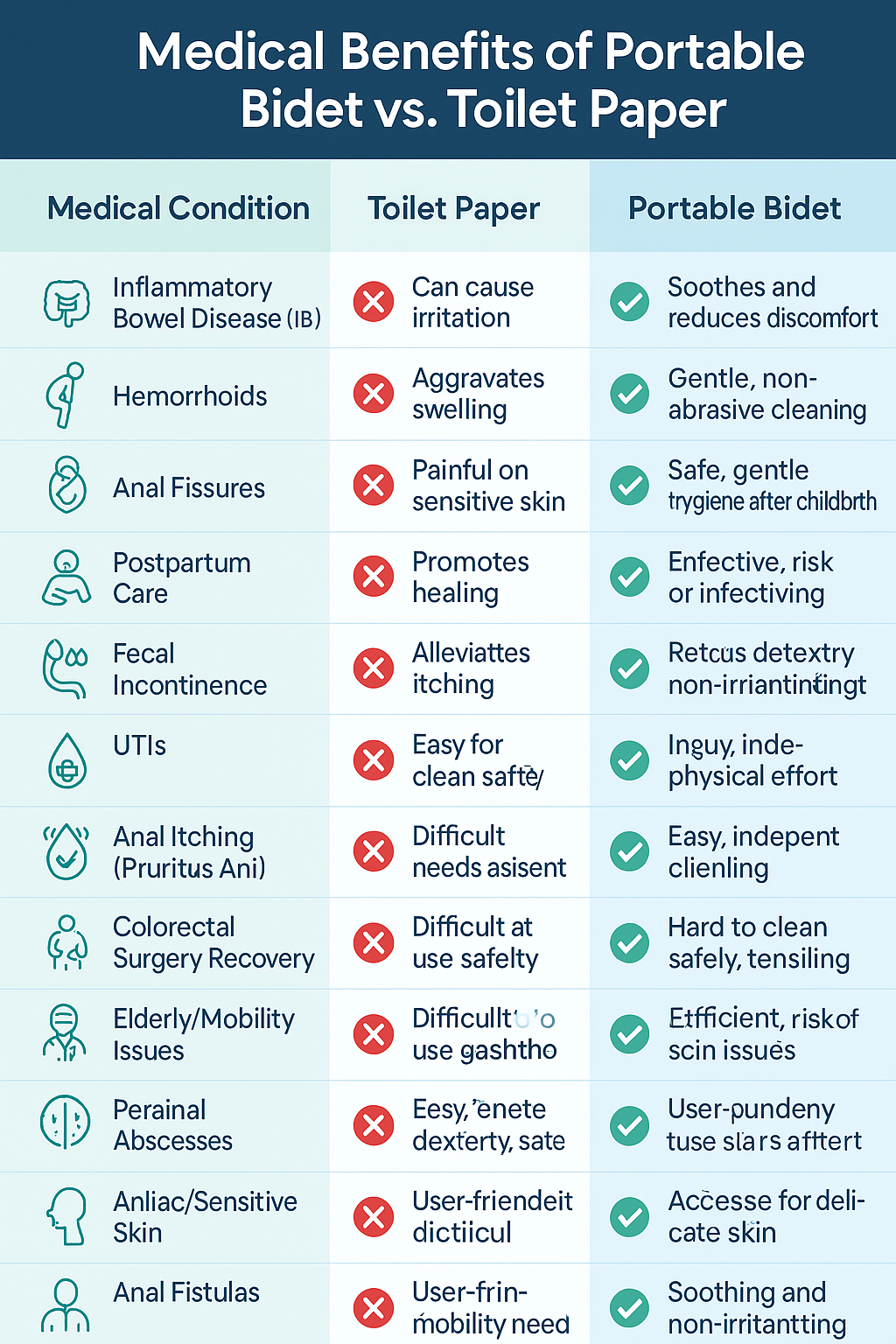 Doctors often recommend bidets for conditions like hemorrhoids, infections, or anal discomfort. They’re also a practical solution for seniors, postpartum moms, or anyone who struggles with mobility. The hygienic, hands-free approach minimizes contact and maximizes care.
